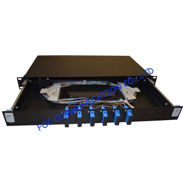 1U fiber optic patch panel provide the network flexibility in a smaller package. It allows for 12ports SC simplex or LC duplex adapters and pigtails. Pre-loaded with SC adapters, 12colors pigtails and splice tray. It is 19" standard patch panel, drawer can be removed for splice work and convenient to connect.